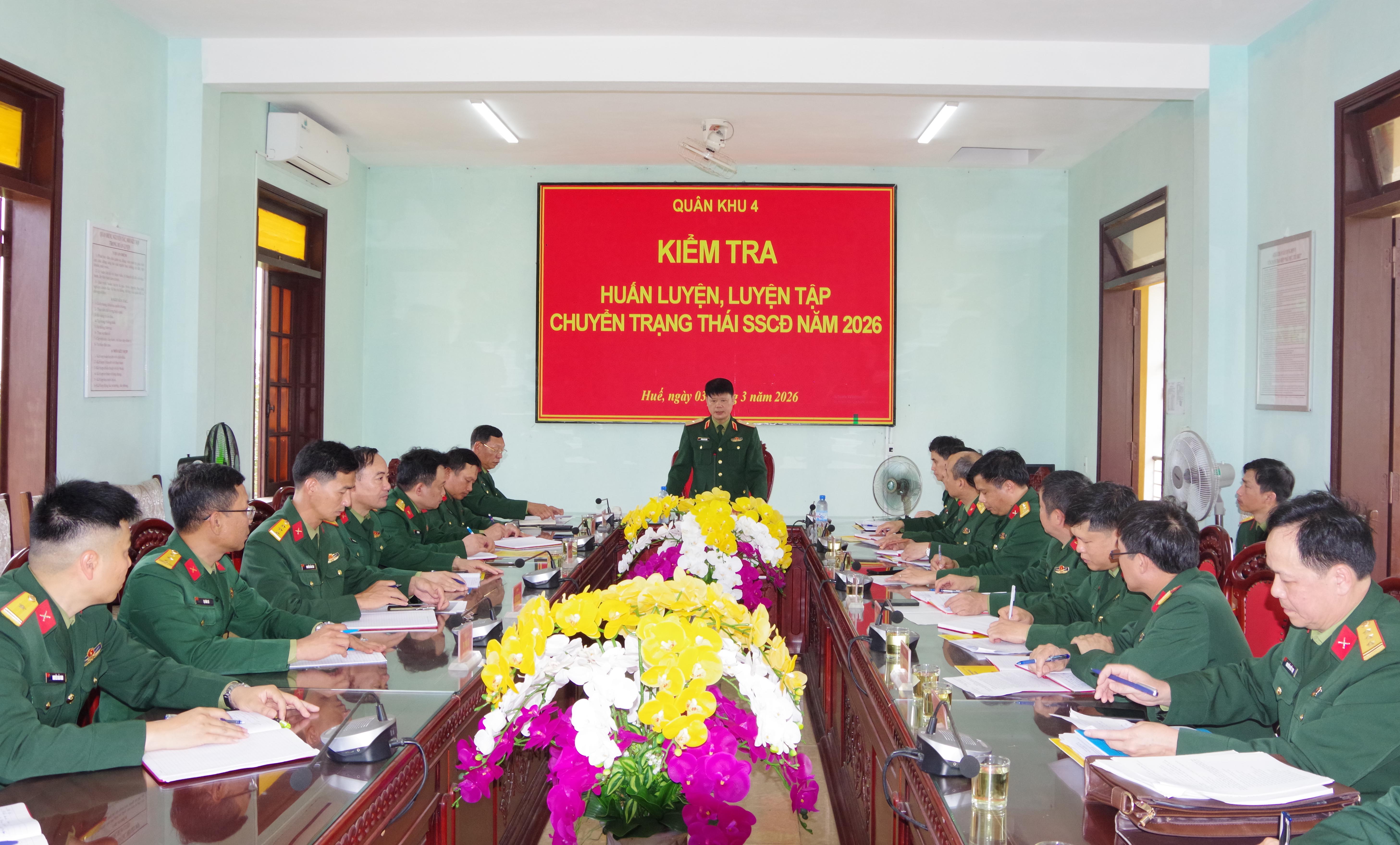 Ngày 03/3, Đoàn công tác Bộ Tư lệnh Quân khu 4 do Thiếu tướng Hoàng Duy Chiến – Phó Tư lệnh Quân khu làm trưởng đoàn đã tiến hành kiểm tra công tác huấn luyện, luyện tập chuyển trạng thái sẵn sàng chiến đấu và công tác chuẩn bị tiếp nhận chiến sĩ mới tại Trung đoàn 6, Bộ CHQS thành phố Huế. Đại tá Nguyễn Huy Việt, Phó Chủ nhiệm Hậu cần - Kỹ thuật Quân khu; Đại tá Phan Thắng - UVTV thành uỷ, Chỉ huy trưởng Bộ CHQS thành phố Huế.