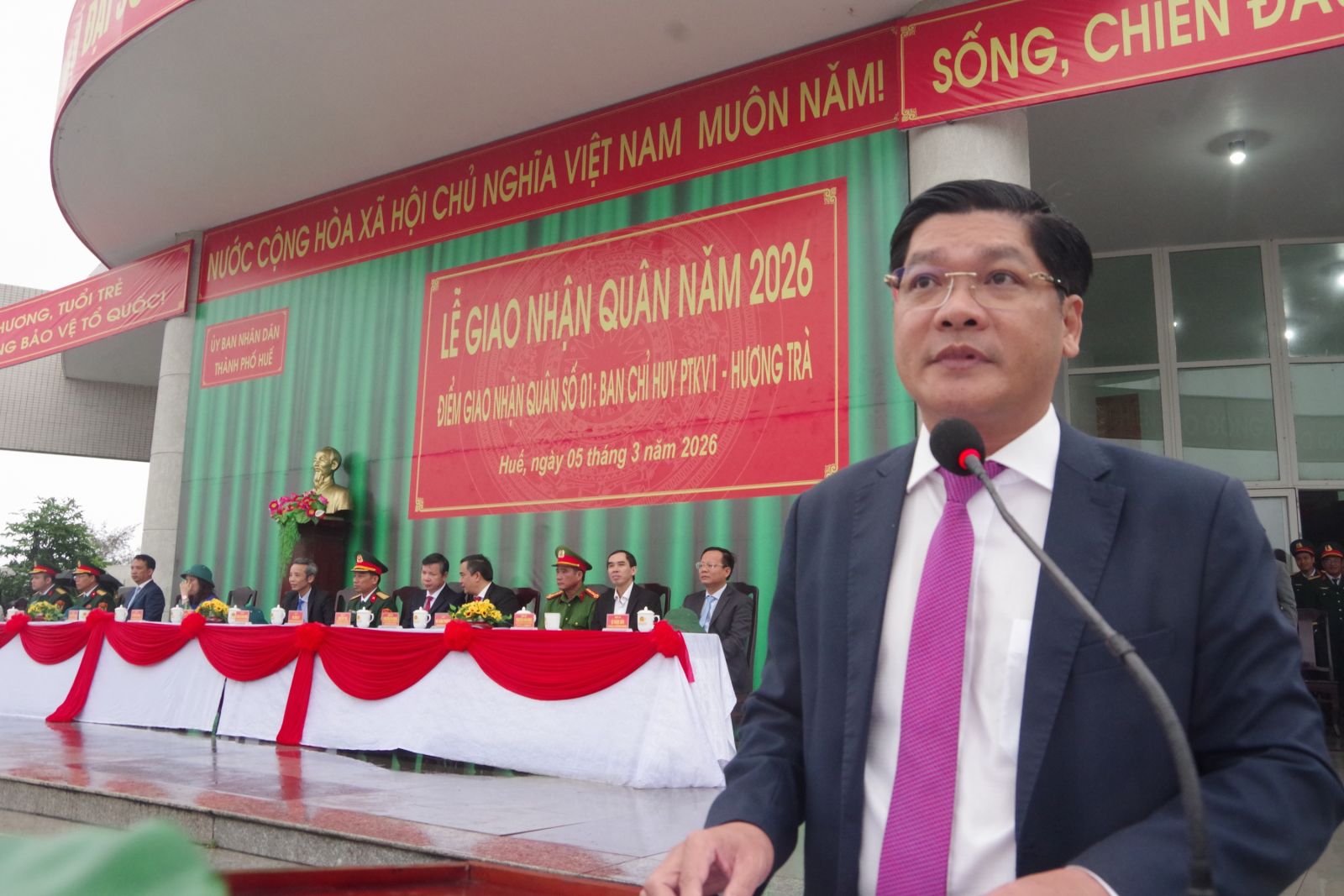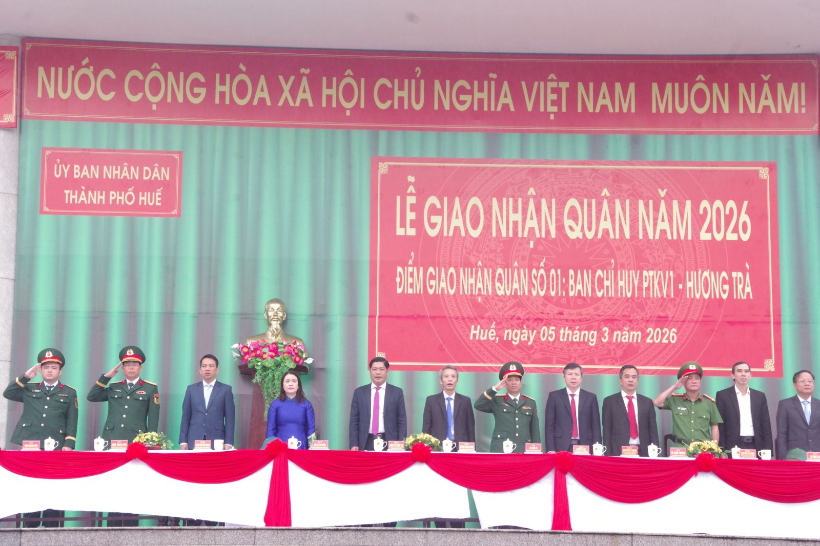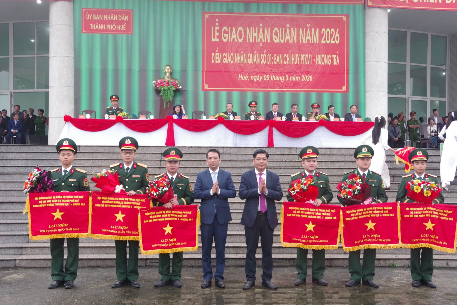 Sáng 05/03/2026, tại điểm giao quân số 1, Ban Chỉ huy PTKV 1 - Hương Trà Trung tâm văn hóa xã Quảng Điền, Hội đồng Nghĩa vụ quân sự thành phố tổ chức Lễ giao nhận quân năm 2026. Đồng chí Nguyễn Chí Tài, Phó Bí thư Thành ủy, Chủ tịch UB MTTQVN thành phố; đồng chí Hoàng Khánh Hùng, UVTV, Trưởng ban Tuyên giáo và Dân vận Thành ủy; đồng chí Hoàng Thị Thu Hằng, UVTV Thành ủy, Chủ nhiệm UBKT Thành ủy; Đại tá Hà Văn Ái, UVTV Đảng ủy Quân sự, Phó Chính ủy Bộ Chỉ huy Quân sự thành phố đến dự buổi Lễ. Cùng dự còn có các đồng chí lãnh đạo cấp ủy, chính quyền các địa phương.