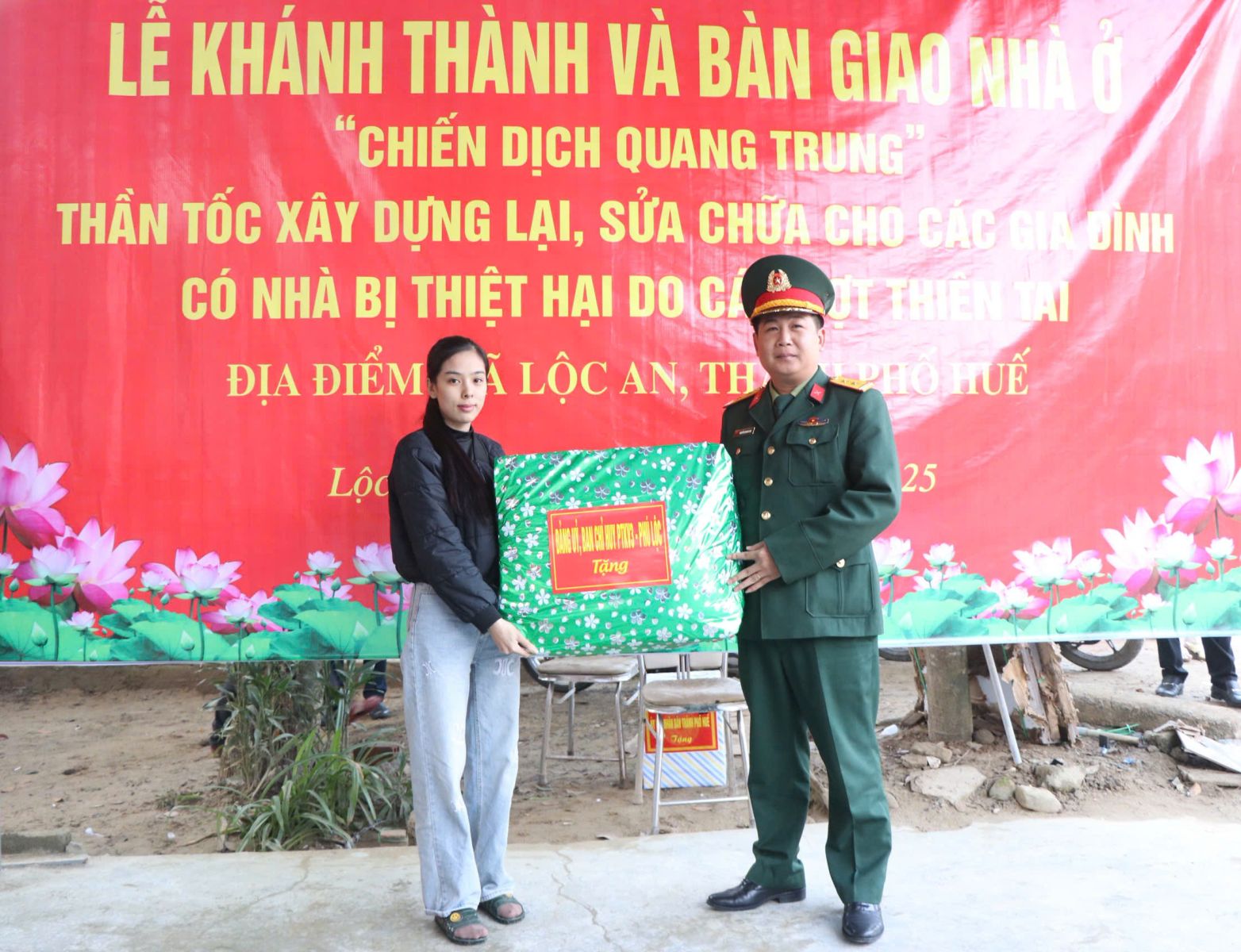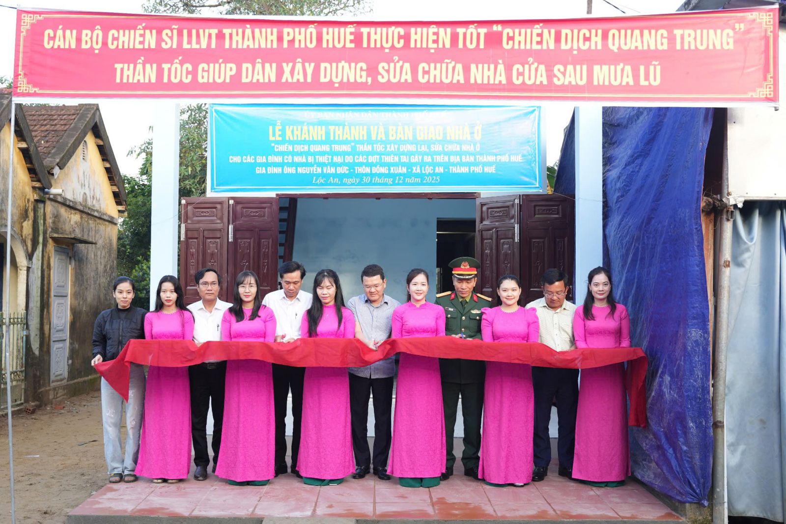 Tại buổi lễ lãnh đạo Thành phố Huế, Bộ CHQS thành phố và các Đại biểu đã cắt băng khánh thành bàn giao ngôi nhà cho gia đình đồng thời tặng nhiều phần quà ý nghĩa cho gia đình. Sau hơn một tháng thực hiện phát động “Chiến dịch Quang Trung” thì đến nay Thành phố Huế đã hoàn thành sửa chữa 40/40 nhà. Ngoài ngôi nhà đã được khánh thành thì 01 ngôi nhà xây mới tại xã Lộc An cũng đã sắp hoàn thiện; 03 nhà còn lại tại xã Khe Tre cũng đã đạt được trên 85%. Hiện nay các lực lượng Quân đội vẫn đang tập trung tổng lực triển khai và phấn đấu hoàn thành trước ngày 16/1/2026 đảm bảo theo tiến độ được Thủ tướng Chính phủ giao./.