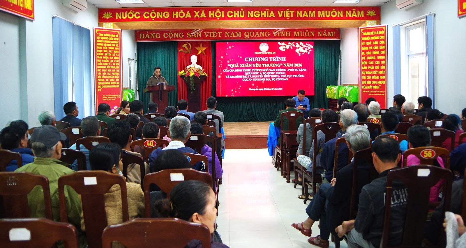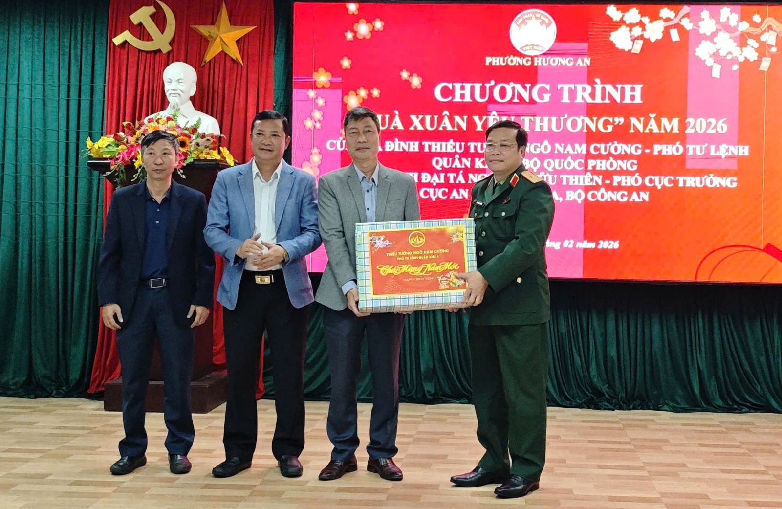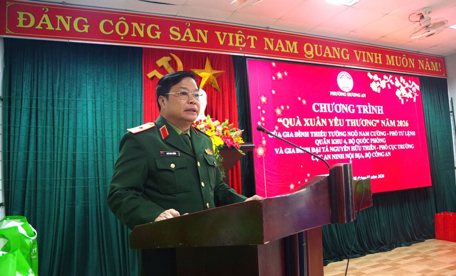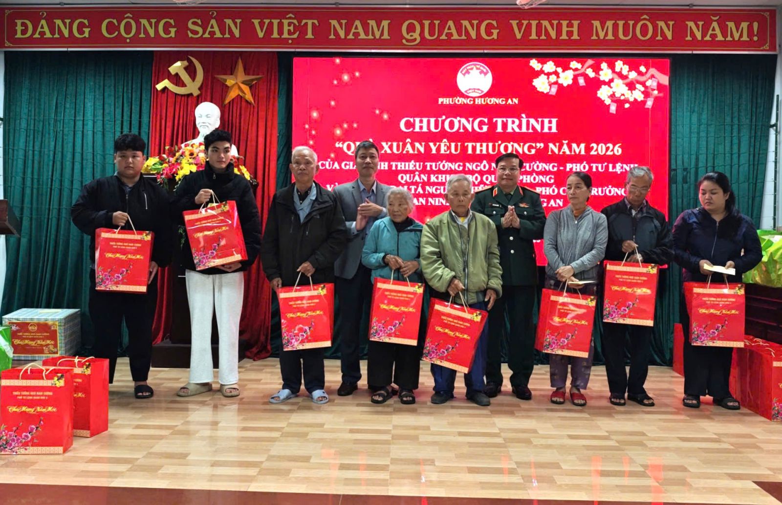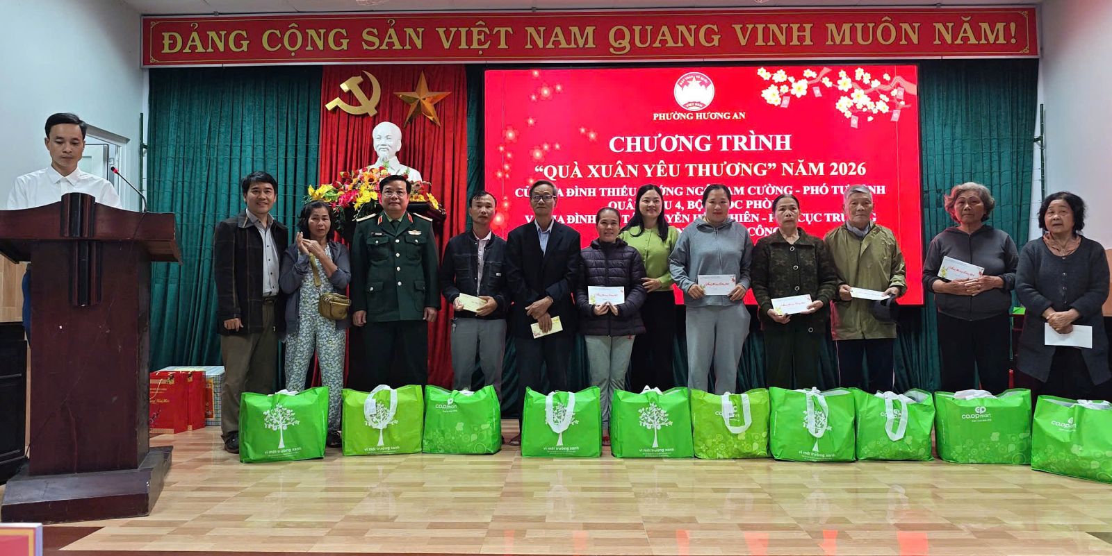 Nhân dịp Tết Nguyên đán Bính Ngọ 2026, gia đình Thiếu tướng Ngô Nam Cường, Phó Tư lệnh Quân khu 4, Bộ Quốc phòng và gia đình Đại tá Nguyễn Hữu Thiên, Phó Cục trưởng Cục An ninh nội địa, Bộ Công an đã trao tặng 50 suất quà Tết cho các hộ gia đình chính sách có hoàn cảnh khó khăn trên địa bàn phường Hương An.