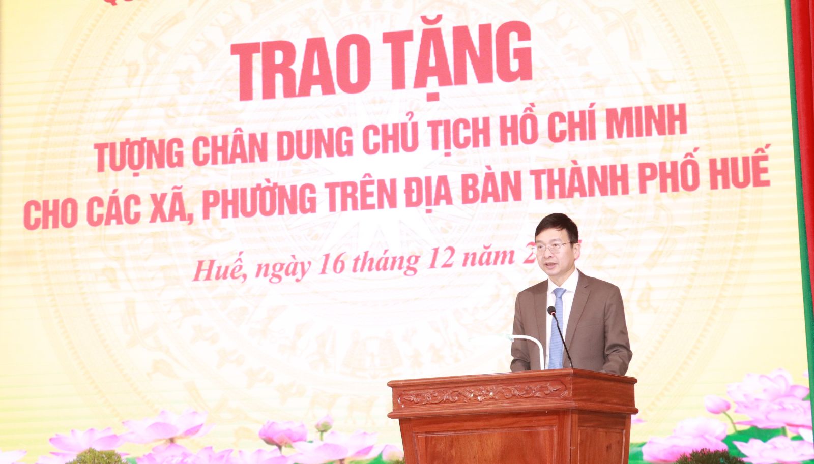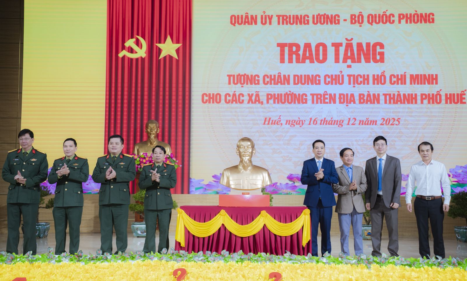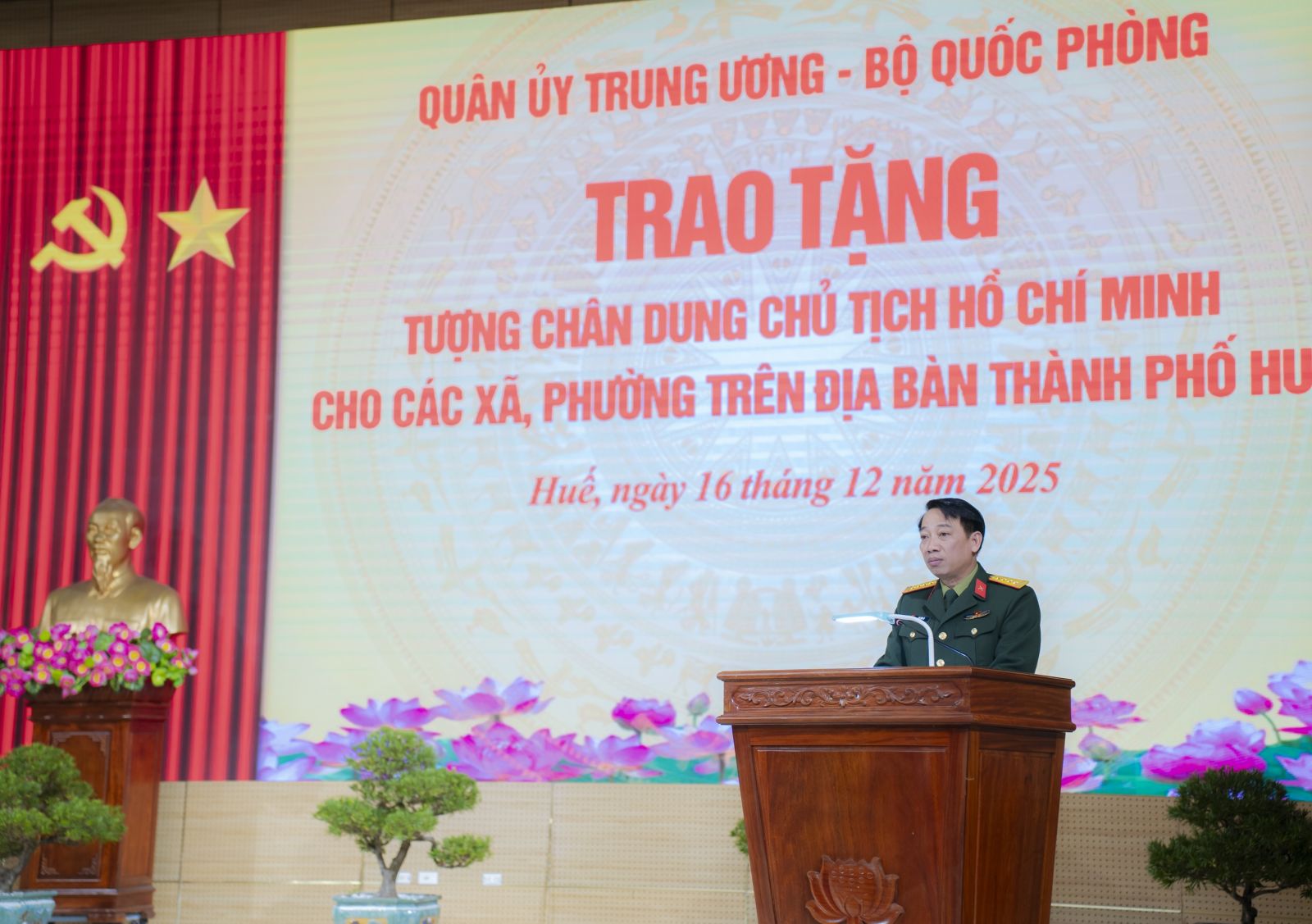 Phát biểu tại buổi trao tặng tượng, Đại tá Hà Văn Ái, Phó Chính ủy Bộ CHQS thành phố Huế nhấn mạnh, Quân ủy Trung ương, Bộ Quốc phòng trao tượng chân dung Chủ tịch Hồ Chí Minh tặng 40 xã, phường trên địa bàn thành phố Huế là hoạt động có ý nghĩa chính trị, tư tưởng và văn hóa đặc biệt sâu sắc, thể hiện tình cảm thiêng liêng, lòng biết ơn vô hạn của Đảng bộ, chính quyền, lực lượng vũ trang và Nhân dân thành phố Huế đối với Chủ tịch Hồ Chí Minh vĩ đại – lãnh tụ thiên tài của Đảng và dân tộc ta; đồng thời đây cũng là hoạt động hướng tới chào mừng kỷ niệm 81 năm Ngày thành lập Quân đội nhân dân Việt Nam (22/12/1944 – 22/12/2025) và 36 năm Ngày hội Quốc phòng toàn dân (22/12/1989 – 22/12/2025).