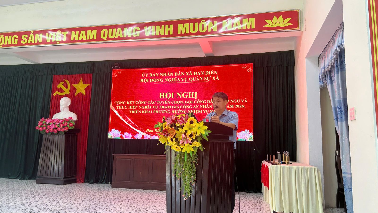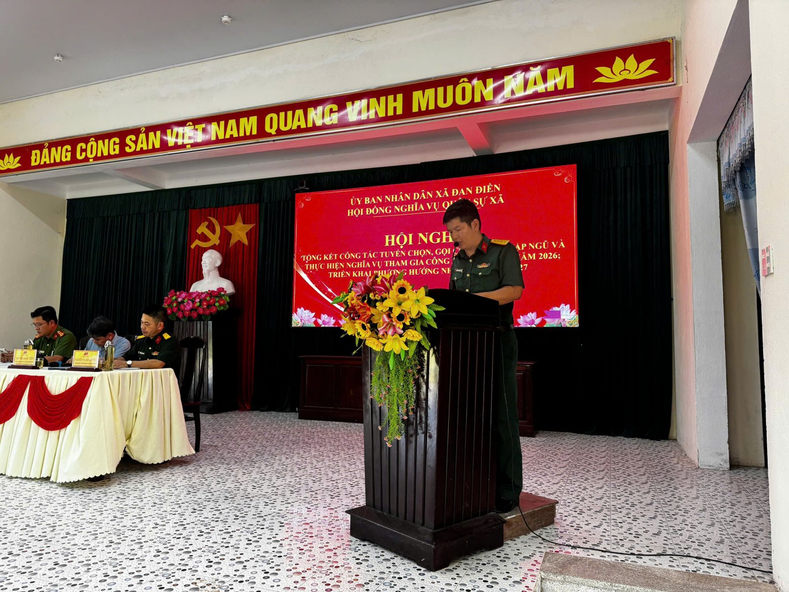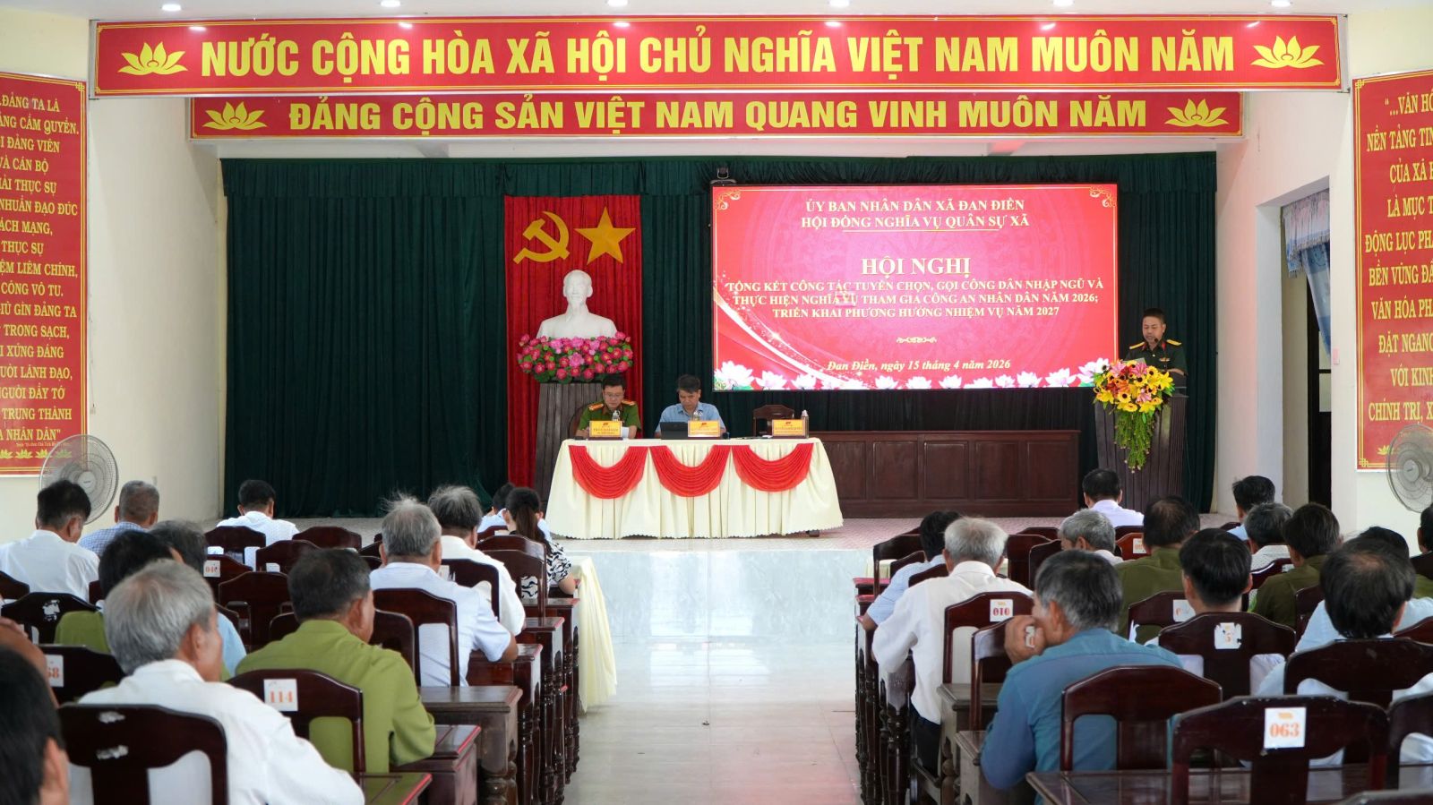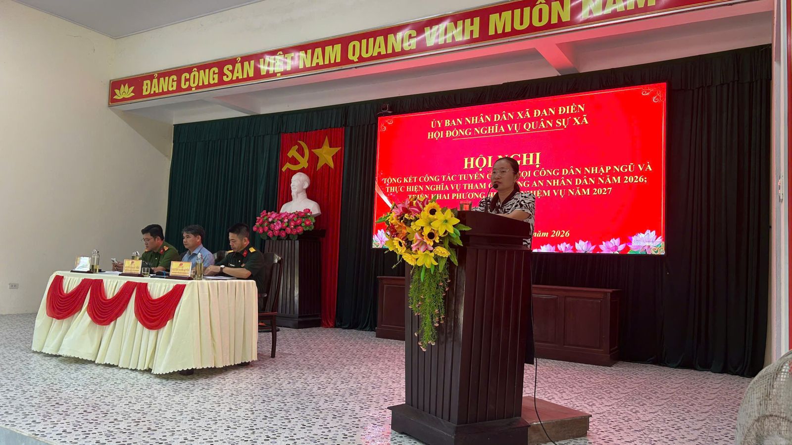 Chiều ngày 15/4/2026 Hội đồng Nghĩa vụ quân sự xã Đan Điền tổ chức Hội nghị tổng kết công tác tuyển chọn và gọi công dân nhập ngũ năm 2026, triển khai phương hướng, nhiệm vụ năm 2027. Tham dự và chỉ đạo Hội nghị có đồng chí Lê Ngọc Đức – Bí thư Đảng ủy, Chủ tịch HĐND xã; các đồng chí trong Thường trực Đảng ủy, HĐND, UBND, Ủy ban MTTQ Việt Nam xã; thành viên Hội đồng Nghĩa vụ quân sự xã; trưởng các ban, ngành, đoàn thể; bí thư chi bộ, trưởng thôn, thôn đội trưởng trên địa bàn.