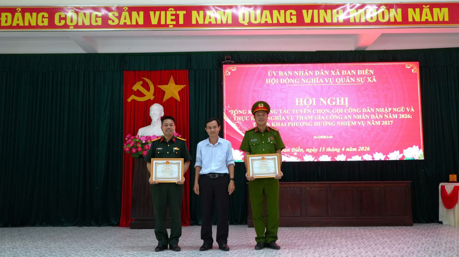 Nhân dịp này, UBND xã Đan Điền đã khen thưởng 02 tập thể và 03 cá nhân có thành tích xuất sắc trong công tác tuyển chọn và gọi công dân nhập ngũ năm 2026.