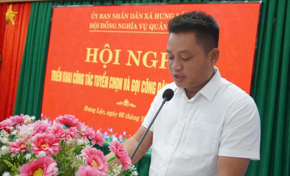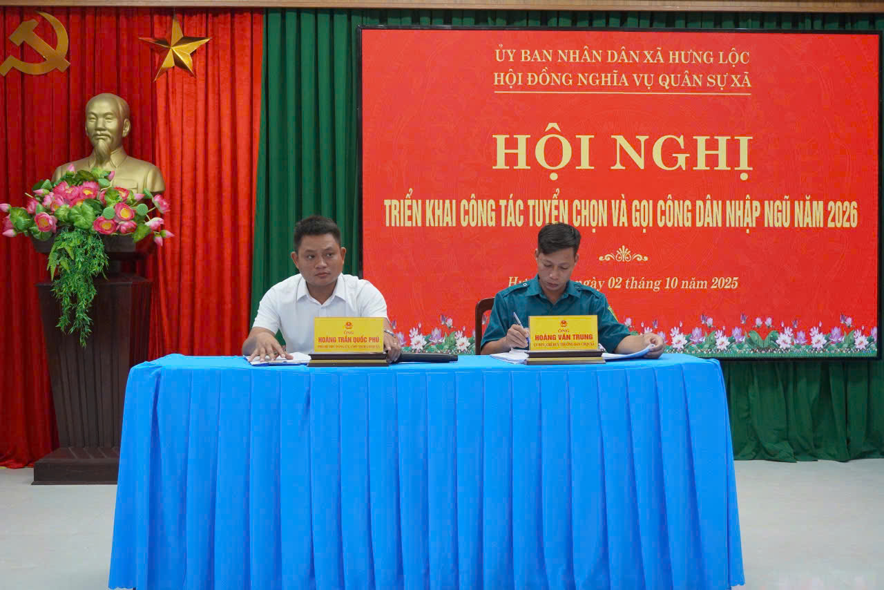 Sáng ngày 02/10, Hội đồng nghĩa vụ quân sự xã Hưng Lộc tổ chức hội nghị triển khai công tác tuyển chọn và gọi công dân nhập ngũ năm 2026. Tham dự hội nghị có đồng chí Thượng tá Lê Đức - Chỉ huy Trưởng Ban chỉ huy phòng thủ khu vực 3 - Phú Lộc, đồng chí Hoàng Trần Quốc Phú - Chủ tịch UBND, Chủ tịch HĐNVQS xã.