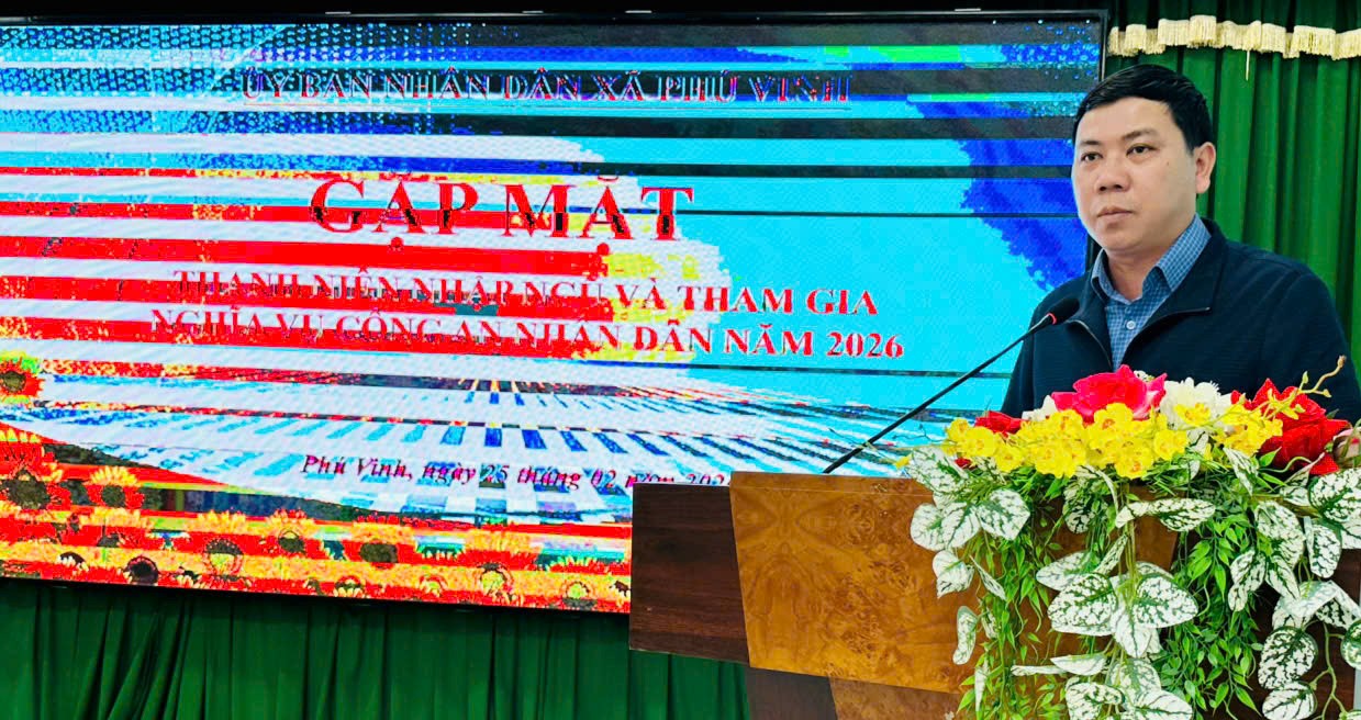 Phát biểu tại buổi gặp mặt, đồng chí Đồng chí Nguyễn Văn Tân - Phó Bí thư Đảng uỷ, Chủ tịch UBND xã đã ghi nhận và biểu dương tinh thần hăng hái, gương mẫu của các thanh niên trong việc chấp hành Luật Nghĩa vụ quân sự và Công an nhân dân. Đồng chí nhấn mạnh, đây không chỉ là nhiệm vụ vẻ vang của công dân mà còn là môi trường rèn luyện, trưởng để mỗi người trẻ cống hiến và phát triển. Đồng thời gửi gắm niềm tin và mong muốn các tân binh sẽ phát huy truyền thống quê hương Phú Vinh anh hùng, an tâm tư tưởng học tập công tác, ra sức phấn đấu học tập, rèn luyện, chấp hành nghiêm kỷ luật, hoàn thành xuất sắc mọi nhiệm vụ được giao./.