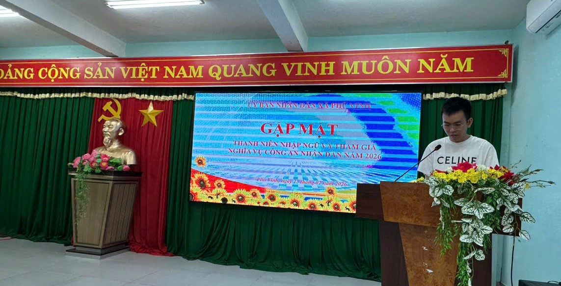 Chiều ngày 25/02, Đảng ủy, HĐND, UBND, Ủy ban MTTQ Việt Nam xã Phú Vinh gặp mặt động viên các thanh niên ưu tú của địa phương trước khi lên đường thực hiện nghĩa vụ quân sự và nghĩa vụ Công an nhân dân năm 2026. Tham dự buổi gặp mặt có đồng chí Dương Hoàng Giang - Bí thư Đảng ủy, Chủ tịch HĐND xã.