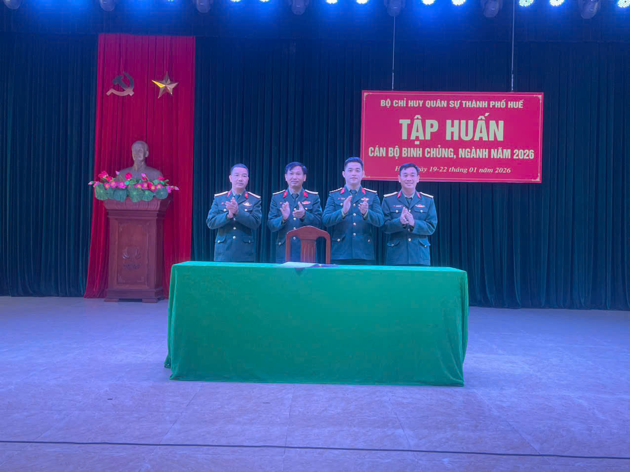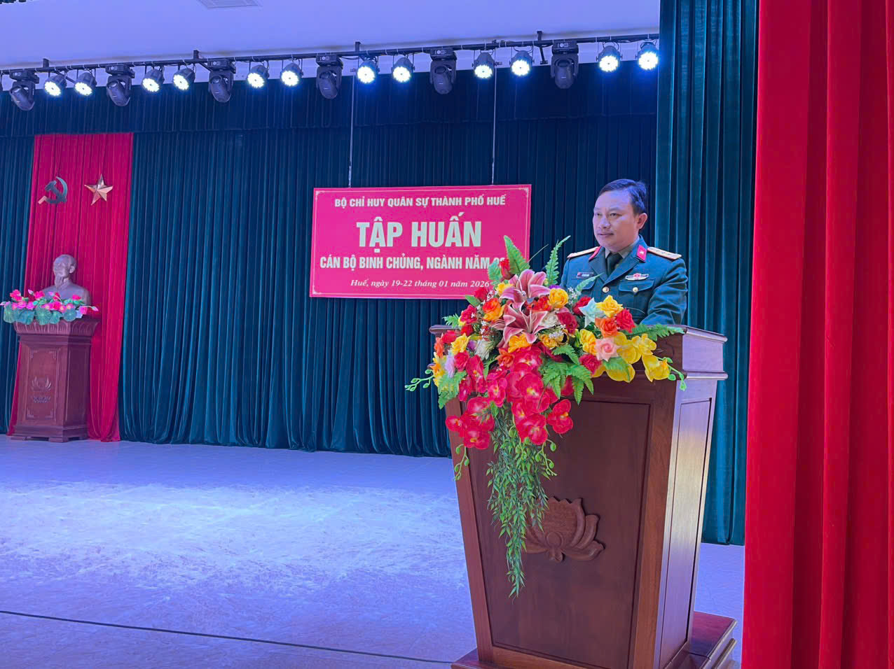 Sáng 19/01/2026, Bộ chỉ huy quân sự thành phố Huế tổ chức khai mạc lớp tập huấn cán bộ binh chủng, ngành năm 2026 cho các đồng chí là cán bộ binh chủng thuộc Cơ quan Bộ chỉ huy, Ban chỉ huy phòng thủ các khu vực, Trung đoàn 6. Thượng tá Lê Xuân Sanh – Phó Tham mưu trưởng Bộ CHQS thành phố, trưởng ban tổ chức lớp tập huấn phát biểu khai mạc.