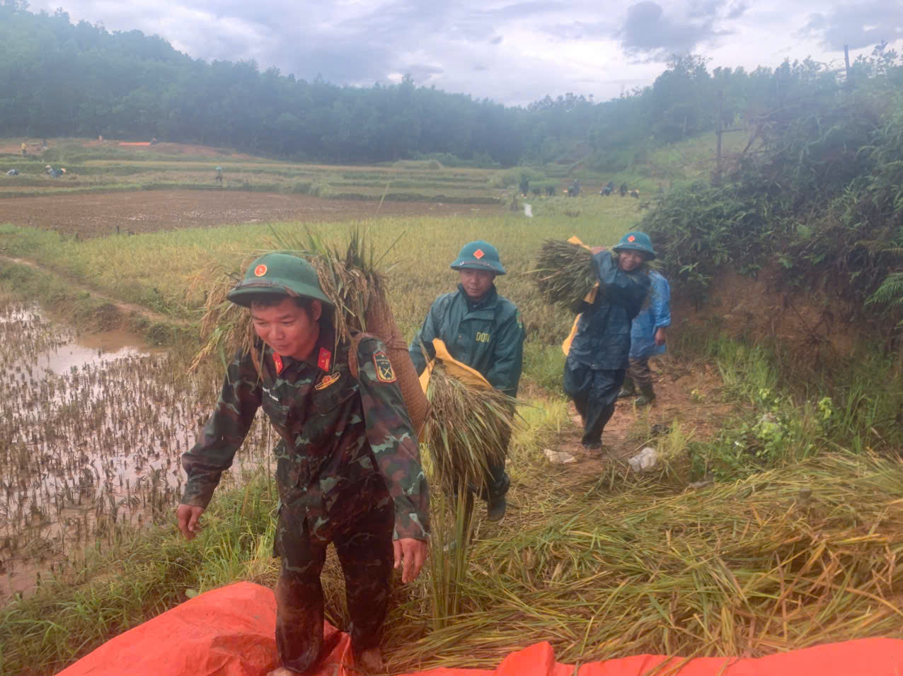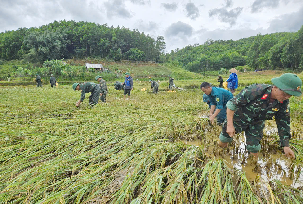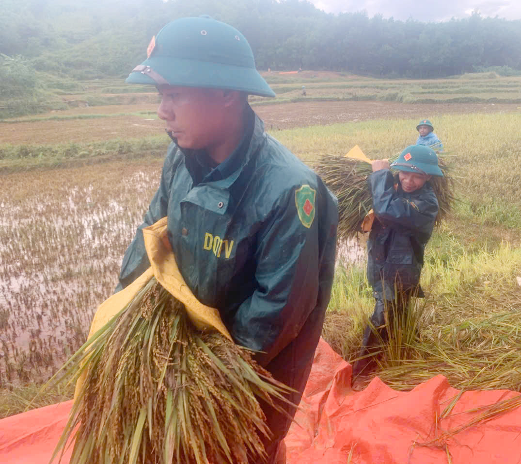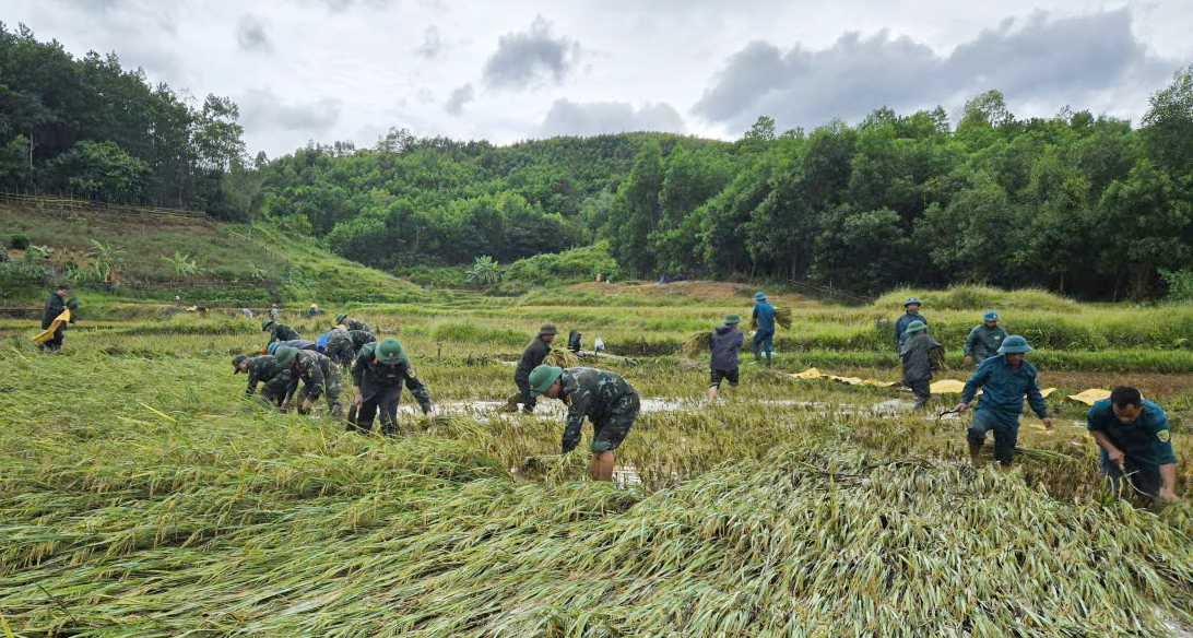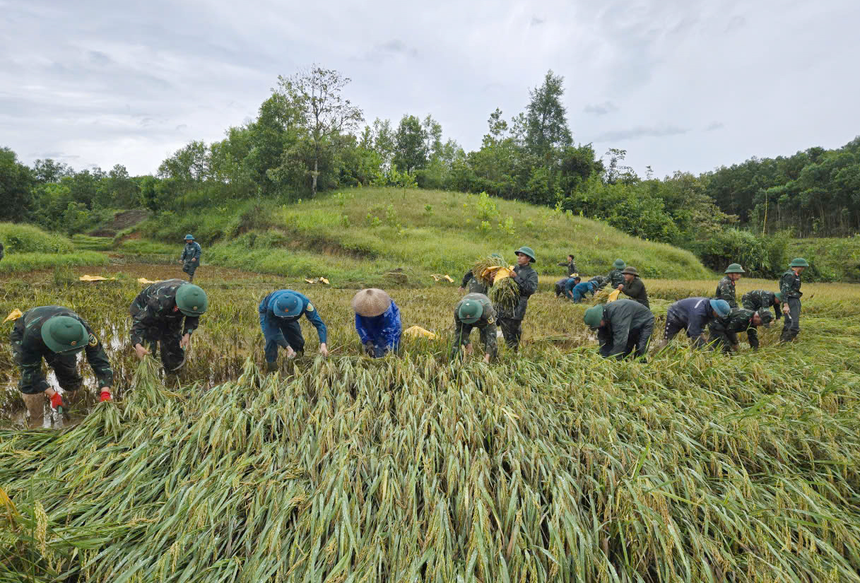 Bão số 10 đi qua đã làm cho hàng chục heta lúa đến mùa vụ thu hoạch của người dân xã A Lưới 3, thành phố Huế bị ngã đổ, ngập úng. Trước tình hình trên, để nhanh chóng giúp người dân, Bộ Chủ huy Quân sự thành phố Huế chỉ đạo Ban Chỉ huy phòng thủ khu vực 2 - A Lưới huy động gần 50 cán bộ, chiến sĩ phối hợp với lực lương dân quân xã A Lưới 3 khẩn trương thu hoạch lúa giúp dân, nhằm giảm thiểu thiệt hại do bão gây ra. Với phương châm “Xanh nhà hơn già đồng”, cán bộ, chiến sĩ cùng các lực lượng của địa phương đã chạy đua với thời gian, vừa giúp người dân thu hoạch, tuốt lúa và vận chuyển về nhà cho bà con.