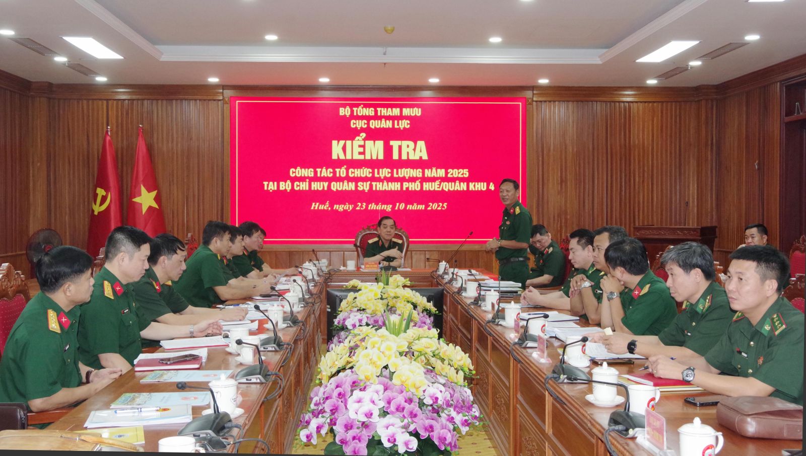 Ngày 23/10, Đoàn công tác Cục quân lực, Bộ Tổng tham mưu Quân đội nhân dân Việt Nam do Thiếu tướng Lường Văn Thắng – Phó Cục trưởng Cục quân lực làm trưởng đoàn đã đã đến kiểm tra công tác xây dựng lực lượng năm 2025 tại Bộ CHQS thành phố Huế. Tiếp và làm việc cùng Đoàn có Thiếu tướng Lê Văn Vỹ - Phó Tham mưu trưởng Quân khu 4, về phía Bộ CHQS thành phố có Đại tá Phan Thắng - UVTV thành ủy, Chỉ huy trưởng, Thượng tá Trương Viết Hải - Phó bí thư thường trực đảng ủy, Chính ủy, Đại tá Lê Huy Nghĩa - Phó Chỉ huy trưởng, Tham mưu trưởng, Đại tá Hoàng Minh Hùng - Phó Chỉ huy trưởng Bộ CHQS thành phố kiêm Chỉ huy trưởng Ban CHBĐ Biên Phòng.