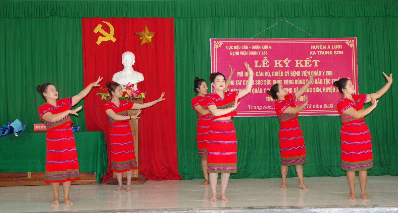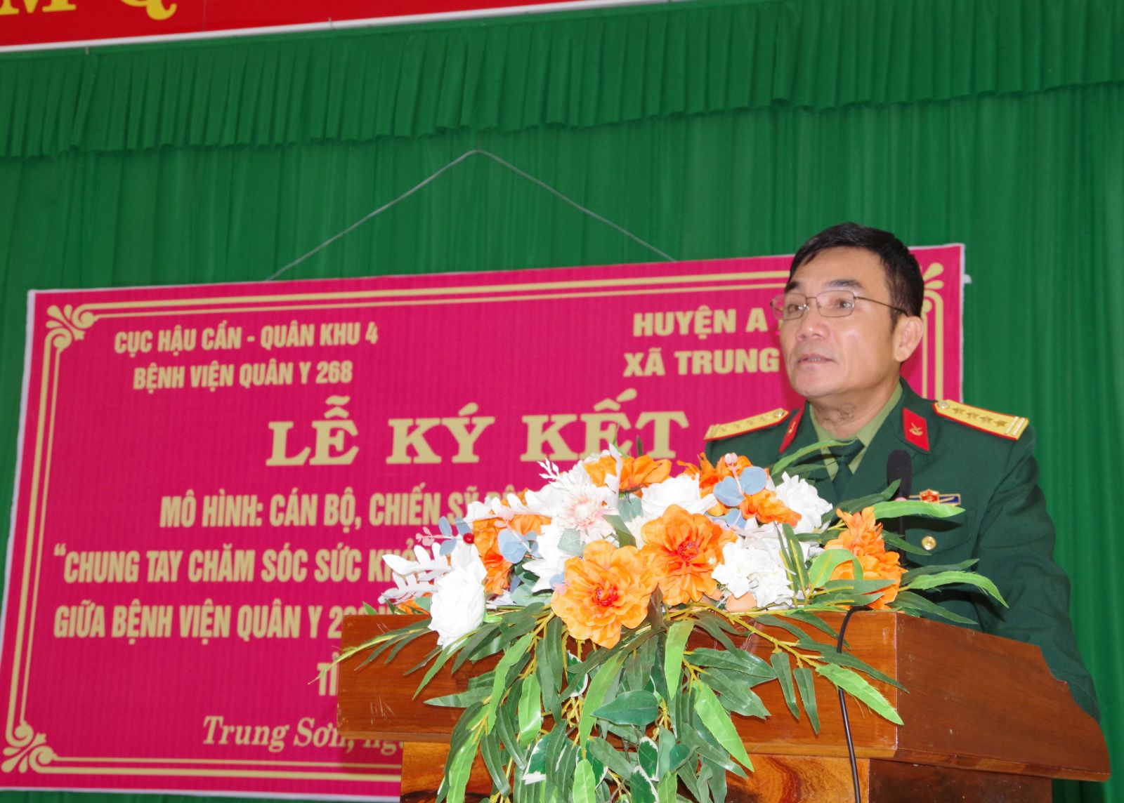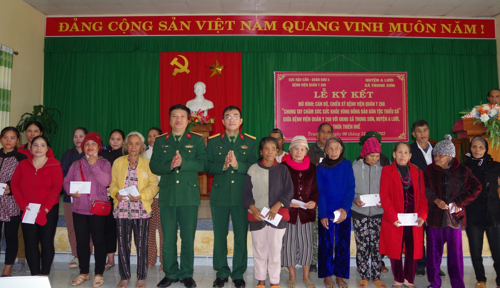 Nhằm chăm sóc sức khỏe cho gia đình chính sách, gia đình có công với cách mạng, bà con nhân dân vùng sâu, vùng xa, có hoàn cảnh khó khăn, ngày 06/12, Bệnh viện Quân y 268 – Cục Hậu cần – Quân khu 4 đã phối hợp với cấp uỷ chính quyền địa phương xã Trung Sơn, huyện A Lưới, tỉnh Thừa Thiên Huế tổ chức lễ ký kết thực hiện mô hình cán bộ, chiến sĩ Bệnh viện Quân y 268 ‘Chung tay chăm sóc sức khỏe vùng đồng bào dân tộc thiểu số” và khám, tư vấn sức khoẻ, cấp phát thuốc miễn phí cho trên 300 lượt bà con nhân dân tại xã Trung Sơn, huyện A Lưới.