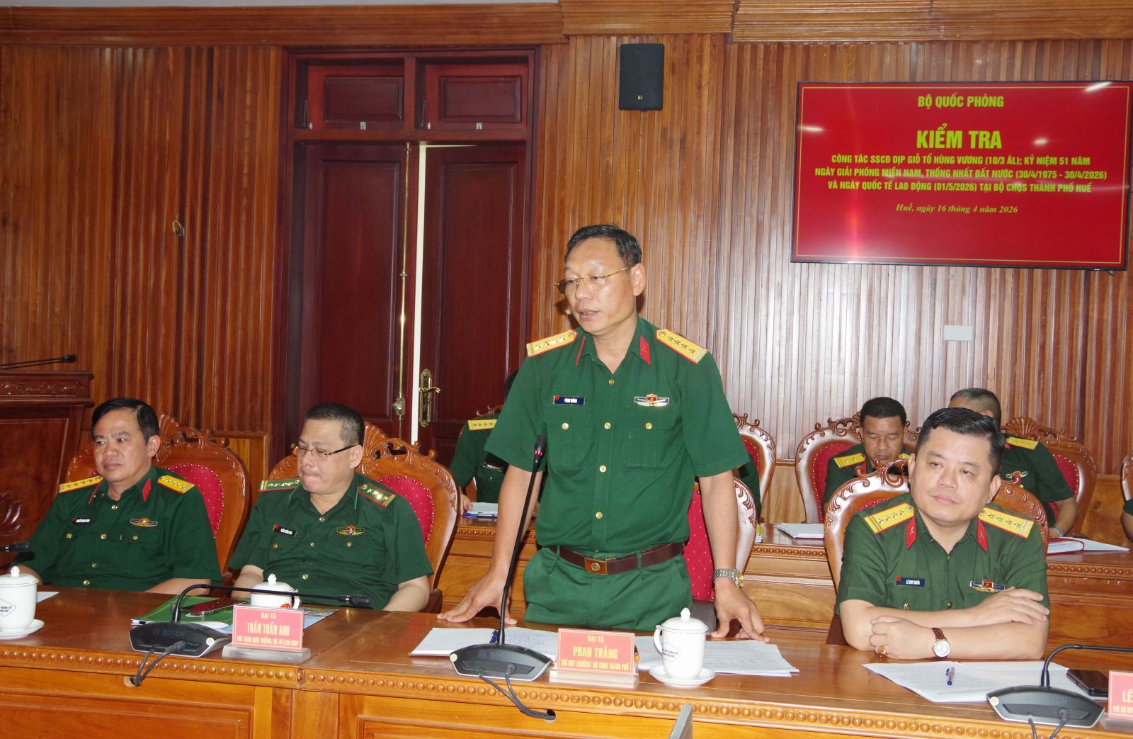 Ngày 16/4, Đoàn công tác Bộ quốc phòng do Thiếu tướng Lê Văn Đãng - Phó Cục trưởng Cục Tác chiến, Bộ Tổng tham mưu Quân đội nhân dân Việt Nam làm trưởng đoàn đã tiến hành kiểm tra công tác sẵn sàng chiến đấu dịp giỗ Tổ Hùng Vương (10/3, âm lịch), kỉ niệm 51 năm ngày phóng Miền Nam thống nhất đất nước 30/4 và ngày quốc tế lao động 01/5 tại Bộ CHQS thành phố Huế. Dự và làm việc với Đoàn có đồng chí Đại tá Nguyễn Trung Thành, Phó Tham mưu trưởng Quân khu, Đại tá Phan Thắng, Chỉ huy trưởng Bộ chỉ huy quân sự (CHQS) thành phố Huế.