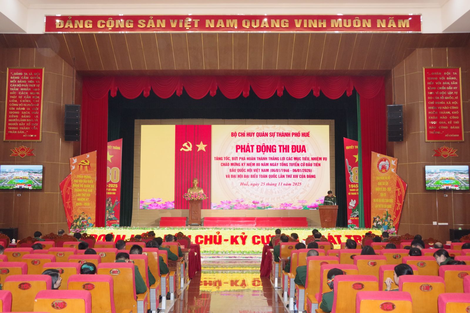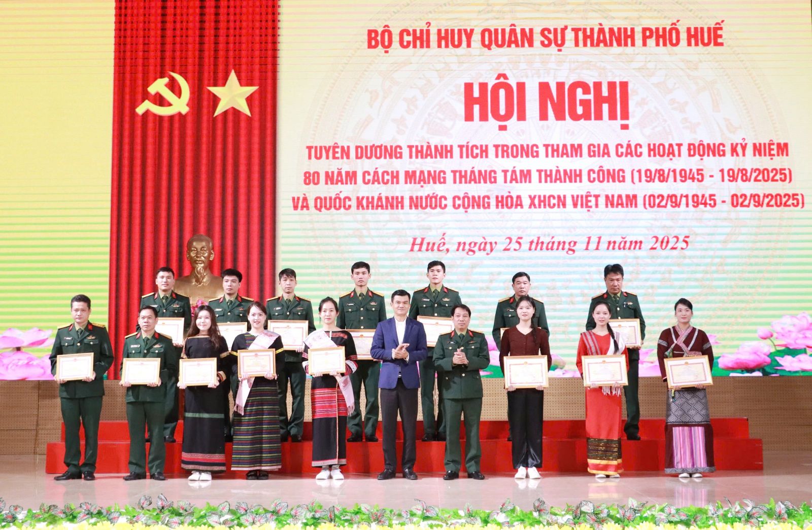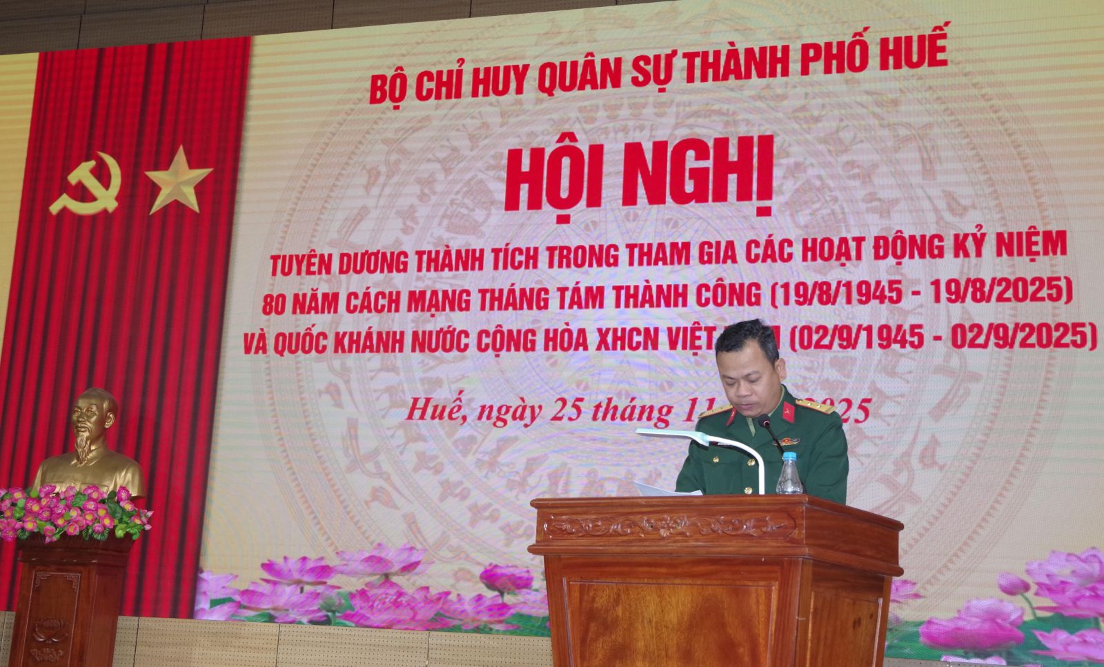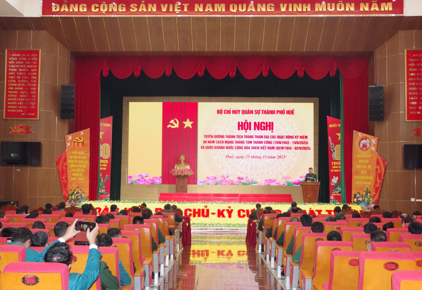 Sáng ngày 25/11, Bộ CHQS thành phố Huế đã tổ chức hội nghị tuyên dương các tập thể, cá nhân có thành tích xuất sắc trong tham gia các hoạt động kỷ niệm 80 năm cách mạng tháng 8 thành công (19/8/1945 – 19/8/2025) và quốc khánh nước cộng hoà xã hội chủ nghĩa Việt Nam (02/9/1945 – 02/9/2025). Thông báo nhanh kết quả hội nghị lần thứ 14 của Ban chấp hành Trung ương Đảng khoá XIII và Sơ kết phong trào thi đua cao điểm "Phất cao cờ hồng tháng 8 - Thi đua giành 3 nhất". Thượng tá Trương Viết Hải - Thành uỷ viên, Phó bí thư thường trực Đảng uỷ, Chính uỷ Bộ CHQS thành phố chủ trì các hội nghị. Tham dự Hội nghị có đồng chí Nguyễn Thanh Hoài - Thành uỷ viên, Bí thư Thành Đoàn kiêm Phó Chủ tịch Ủy ban MTTQ TP Huế, đồng chí Phan Đỗ Quốc Hùng - Trưởng ban Ban Thi đua - Khen thưởng, Sở Nội vụ. Đại tá Hà Văn Ái - UVTV đảng uỷ, Phó Chính uỷ, Đại tá Hoàng Minh Hùng - UVTV đảng uỷ, Phó Chỉ huy trưởng Bộ CHQS thành phố kiêm Chỉ huy trưởng Ban chỉ huy Bộ đội Biên phòng, Đại tá Đặng Ngọc Hiệu - Phó Chính uỷ Bộ CHQS thành phố kiêm Chính uỷ Ban Chỉ huy Bộ đội Biên Phòng, Thượng tá Hồ Đắc Quốc - Phó Chỉ huy trưởng Bộ CHQS thành phố.