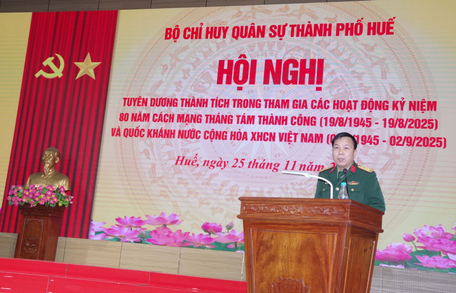 Phát biểu tại hội nghị Thủ trưởng Bộ CHQS thành phố Huế đã ghi nhận và biểu dương tất cả các tập thể, cá nhân đã được khen thưởng đợt này trong đó đặc biệt có 34 đồng chí cán bộ sĩ quan, quân nhân chuyên nghiệp và nữ dân quân đã trực tiếp tham gia các khối diễu binh, diễu hành và phục vụ trong đại lễ kỷ niệm của đất nước, những nỗ lực, cố gắng của các đồng chí đã góp phần quan trọng vào thành công chung trong ngày đại lễ tạo được ấn tượng mạnh mẽ, sức lan toả sâu rộng trong quân chúng nhân dân và bạn bè quốc tế.